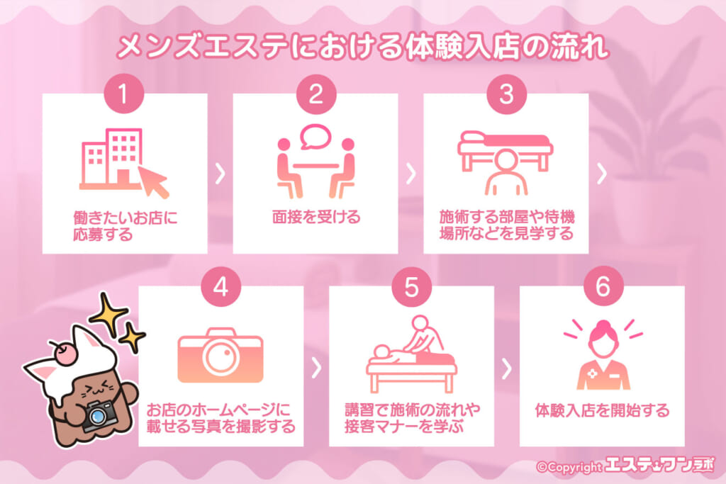 メンズエステで体験入店を行う際の一般的な流れは以下のとおりです。